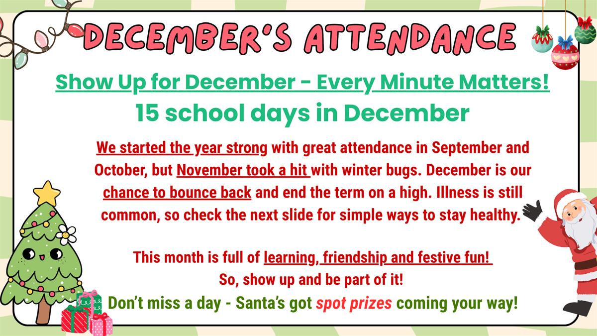 With just 14 school days left in December, let’s aim to make the month one of learning, friendship and festive cheer. Remember that every day counts! Santa will have spot prizes for students who prioritise attendance and make the effort to be in school each day!